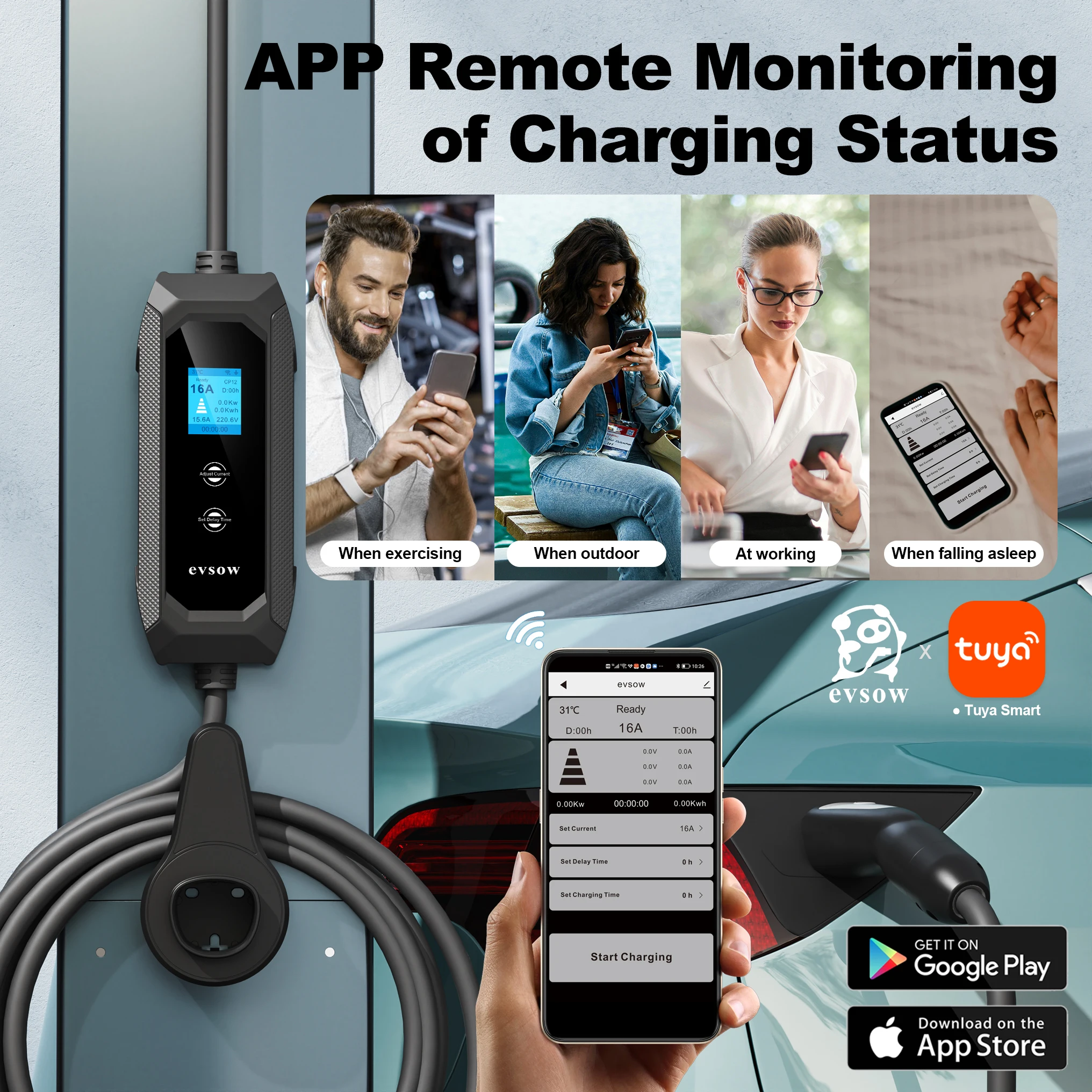 evsow Portable EV Charger For Tesla Cars Models 3/Y/S/X With WIFI APP Control 3.5KW 16A 1P Adjustable Current&Set Charging Time